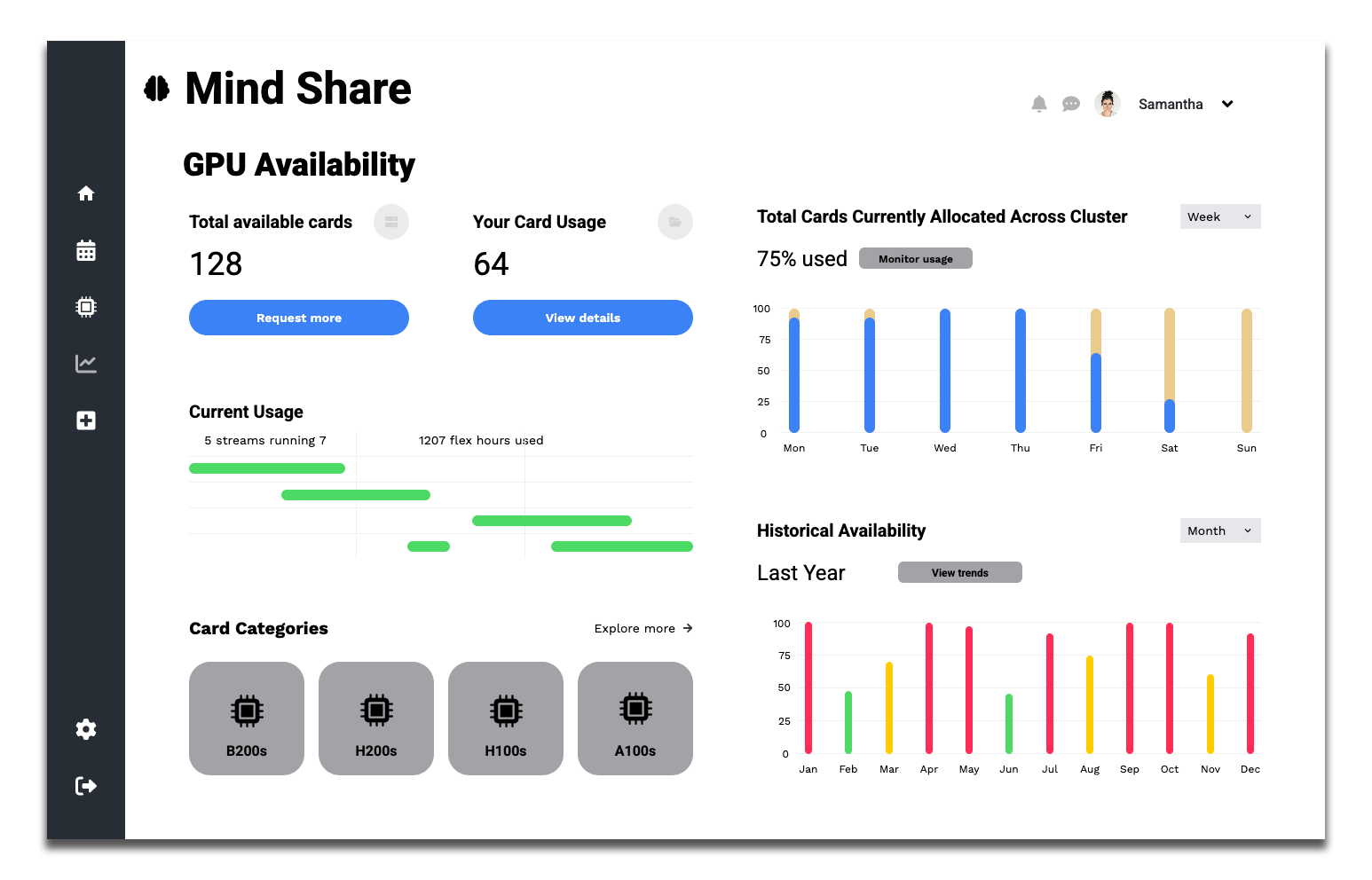 Our GPU timesharing platform gets you the top GPUs you need by sharing them with only 3-5 other companies. Virtual dedicated cards and clusters. No more competing in the open market.